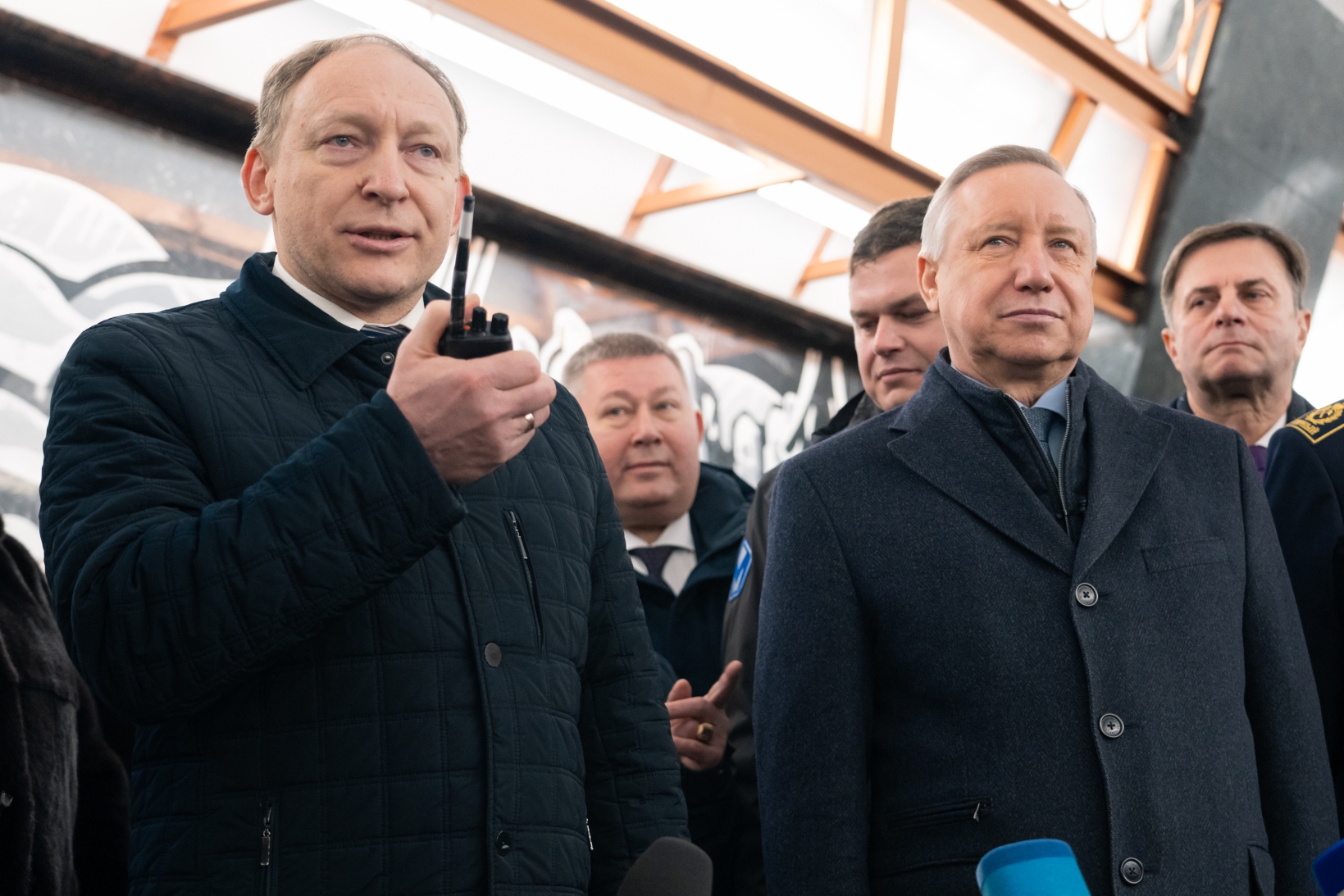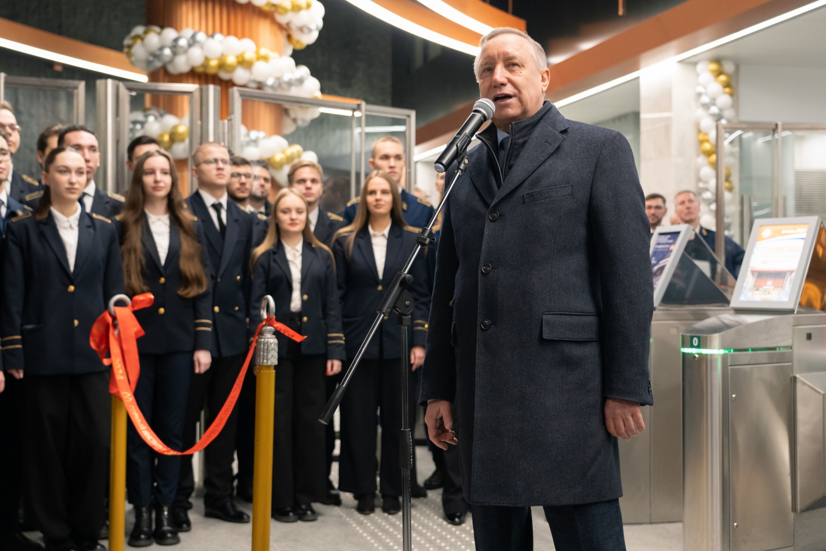 Губернатор Александр Беглов, председатель Законодательного Собрания Александр Бельский и ректор Санкт‐Петербургского горного университета Владимир Литвиненко приняли участие в открытии первой за пять лет новой станции метро «Горный институт»